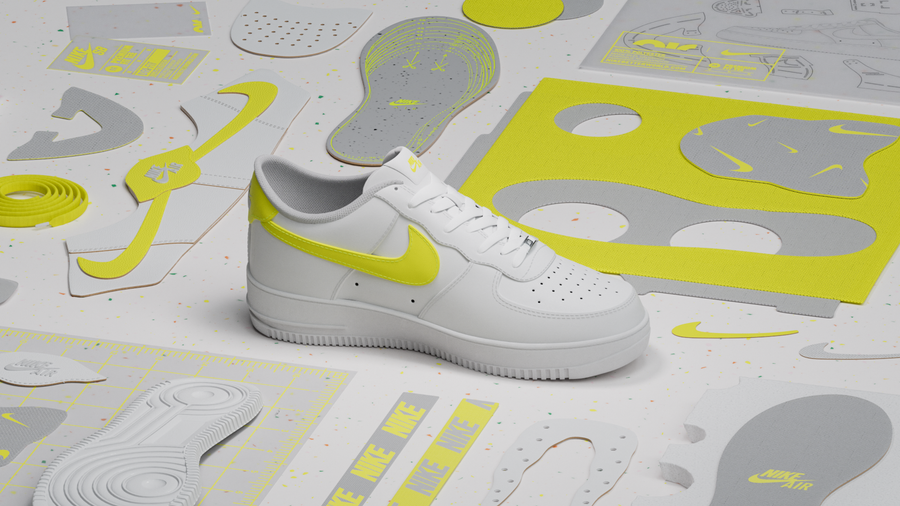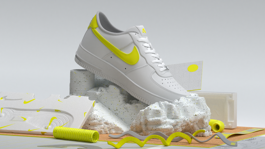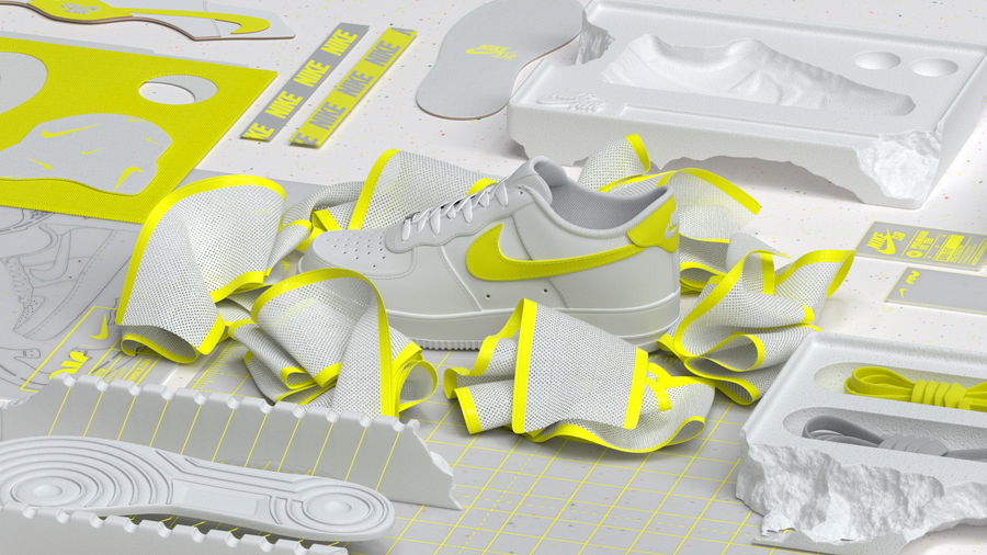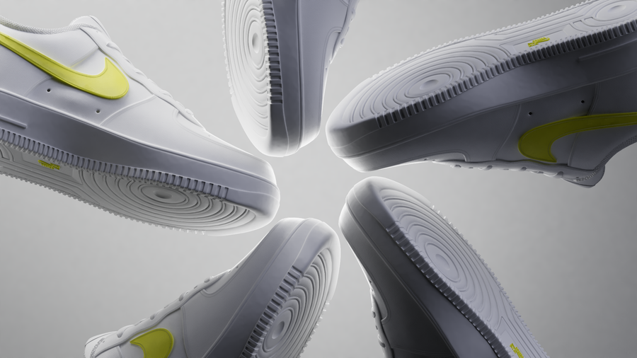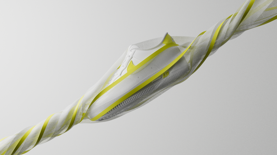 This is a study of Nike's most iconic item: Air Force 1. We imagined a scenario where shapes, fabrics and details share a common spot color, tying the whole sequence together.